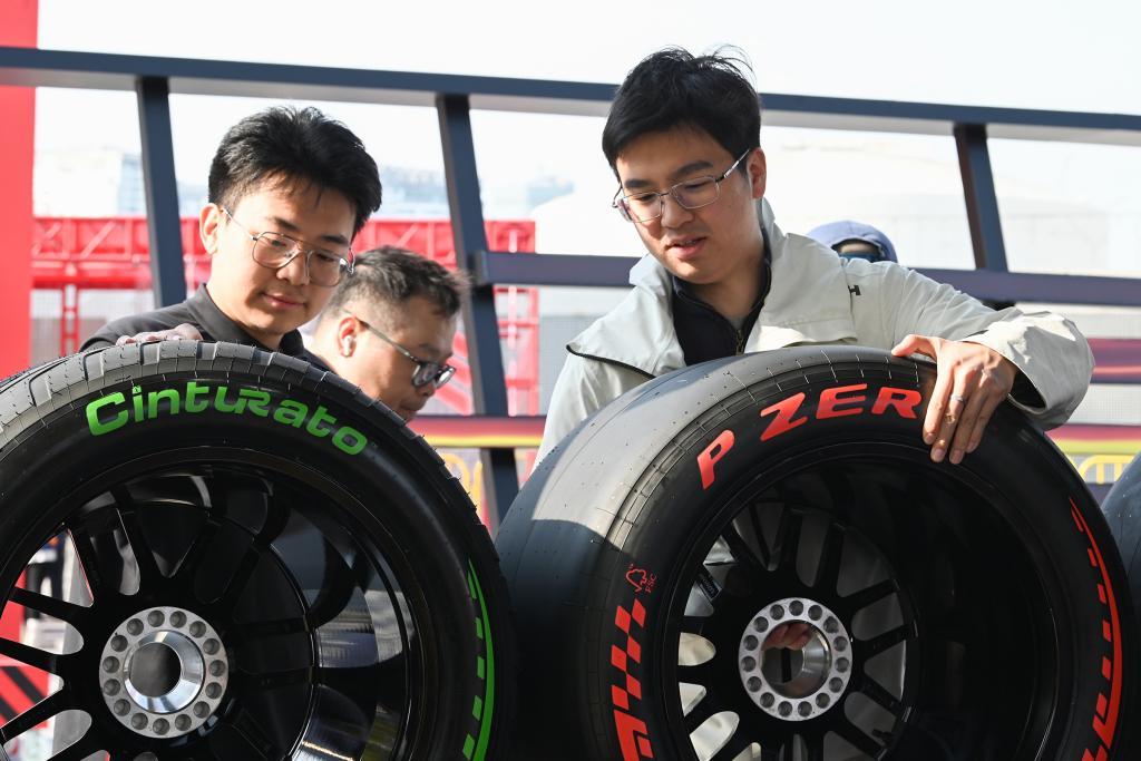 2026年3月11日,上海西岸的格子旗嘉年华上,车迷们近距离接触F1轮胎。澎湃新闻记者 吴栋 图