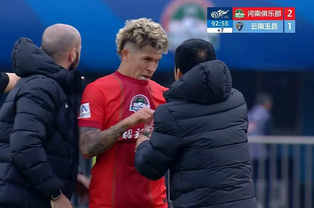 第49分钟,古斯塔沃妙传姆布拉,姆布拉单刀情况下与鲍亚雄身体接触后在对方禁区摔倒,姆布拉表达抗议,但主裁判沈寅豪并未理睬。对方旋即反击中将球打进,河南队长王上源等多名球员提出质疑,奈何VAR只给出云南此次反击是否越位的镜头,对此前姆布拉在对方禁区倒地并未给出清晰镜头和解释,姆布拉是否被犯规成了疑云。